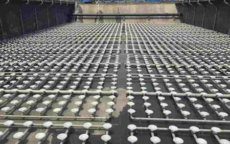 曝气是污水好氧生化处理系统的一个重要工艺环节,它的作用是通过曝气管向反应器内充氧,保证微生物生化作用所需之溶解氧,并保持反应器内微生物、底物、溶解氧,即泥、水、气三者的充分混合,为微生物降解有机物提供有利的生化反应条件。同时,曝气也是污水好氧生化处理系统中运转费用最高的工艺环节,曝气充氧电耗一般占总动力消耗的60%~70%,因此优选能耗少、造价低的曝气装置具有重要意义。