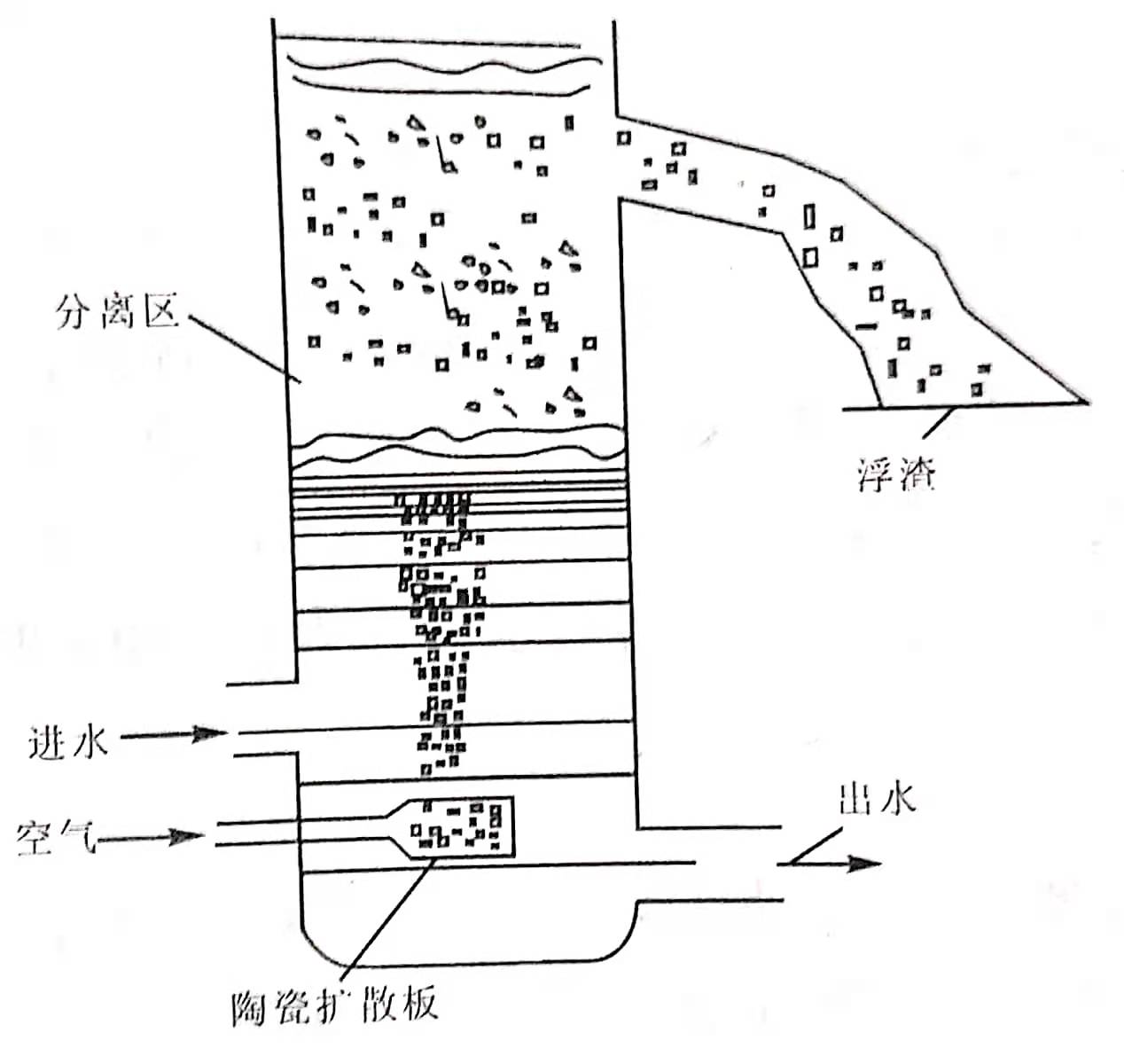 曝气气浮一般采用鼓风机将空气直接送至气浮池充气器,形成细小气泡进入污水中。充气器一般用扩散板、穿孔板或微孔管等,曝气压力在1kg/cm2,空气量2-3m3/m3水。扩散装置的微孔不宜过小,否则易于堵塞;而微孔板孔径过大,必须投加表面活性剂,方可形成可利用的微小气泡,从而导致该种方法使用受到限制。近年研制、开发的弹性膜微孔曝气器克服了扩散装置微孔易堵或孔径大等缺点。扩散板曝气气浮示意图见下图。