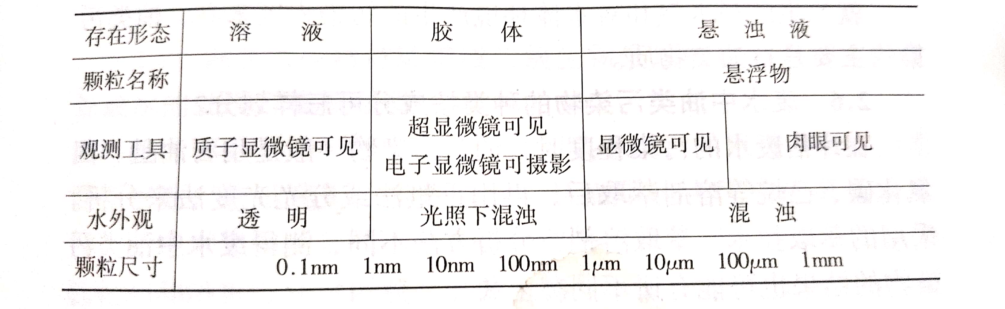 废水中杂质颗粒按存在形态可以分为悬浮物质、胶体物质和溶解性物质等三种,其具体分散状态和尺寸见下图: